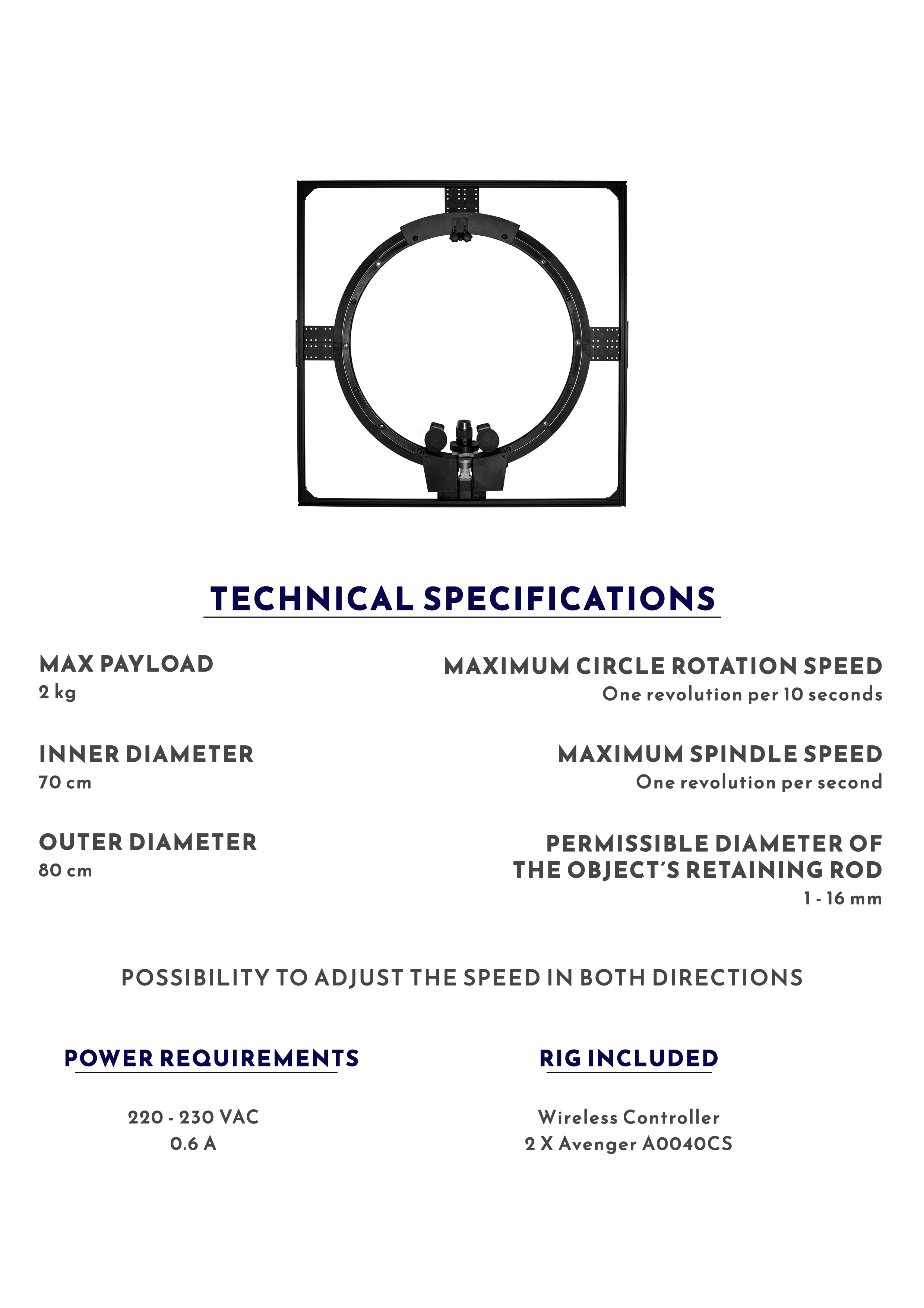 It consists of a motorised 70 cm inner circle, capable of rotating around its axis, and a mandrel that also pivots independently. This dual rotation system offers great freedom of presentation, allowing you to show an object from all angles, with smooth and perfectly controlled movement.